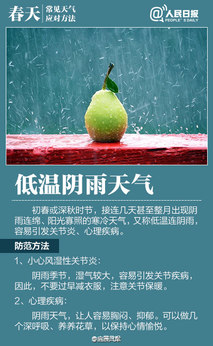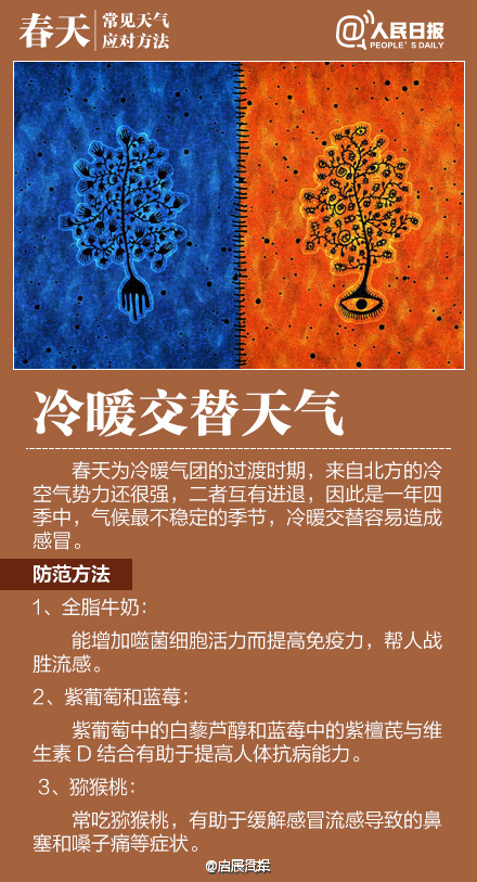 如何應對初春多變天氣作者:合眾電氣發布時間:2016-03-23瀏覽量:11029 次字體顯示:【大】【中】【小】 春季天氣調皮,昨天還日光融融閑賞花,今日就寒風瑟瑟緊添衣!大風、沙塵、陰雨等交替上演,讓感冒、過敏、關節炎等進入高發期。今天#世界氣象日#,四張圖教你應對春季多變天氣! 上一篇: HZXC-104D變壓器智能控制箱最新發貨現場下一篇: 面對問題疫苗,我們怎么辦?