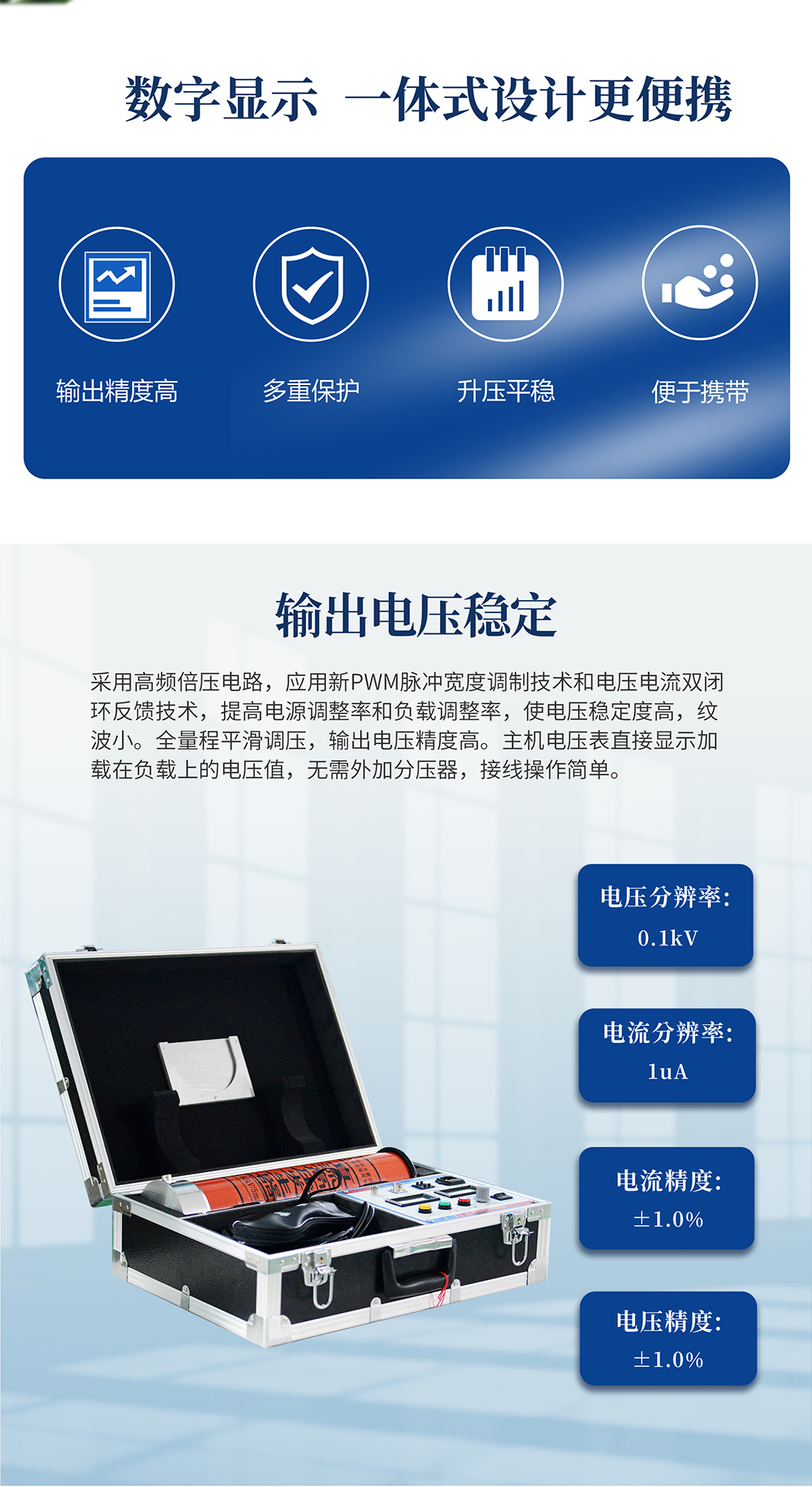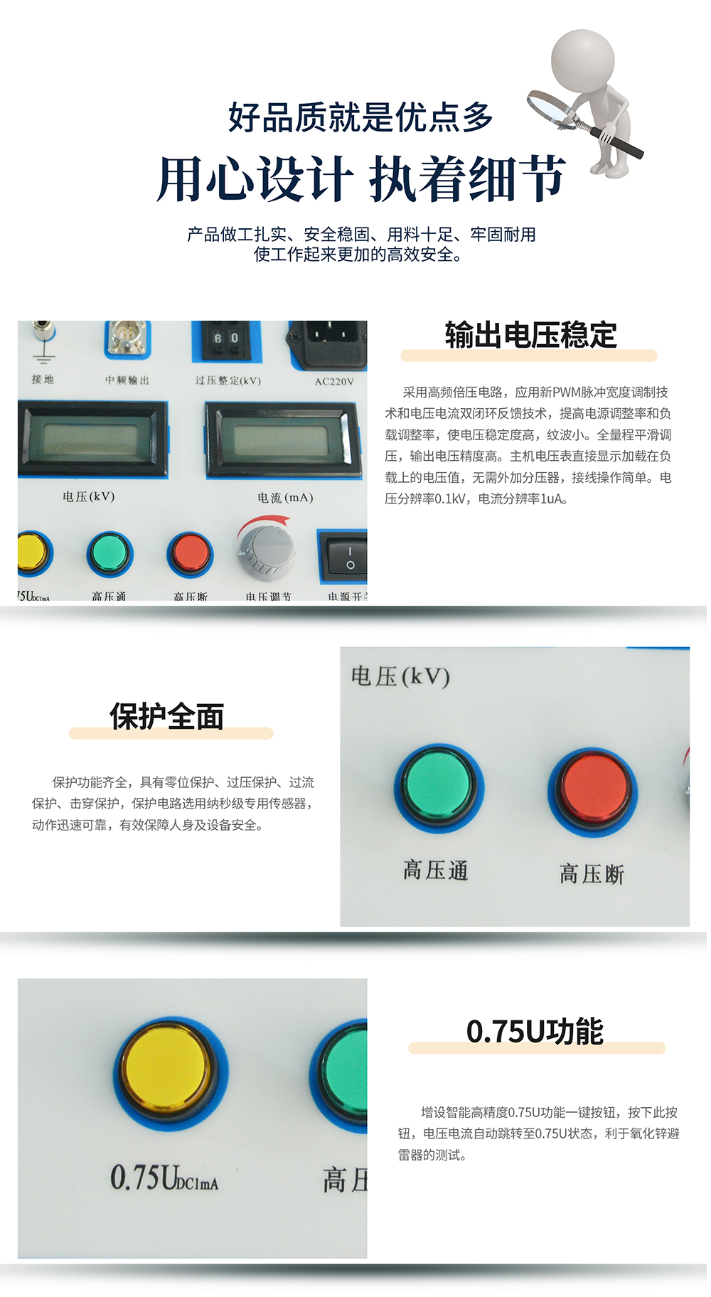 本儀器采用高頻倍壓電路,應(yīng)用新PWM脈沖寬度調(diào)制技術(shù)和電壓電流雙閉環(huán)反饋技術(shù),提高電源調(diào)整率和負(fù)載調(diào)整率,使電壓穩(wěn)定度高,紋波小。使用進(jìn)口大功率IGBT器件及其驅(qū)動(dòng)技術(shù),消除開(kāi)關(guān)干擾,實(shí)現(xiàn)直流高壓發(fā)生器的高品質(zhì)和便攜性。選用進(jìn)口高頻高壓整流二極管,使倍壓筒更加小巧輕便,提升整機(jī)效率。根據(jù)EMI電磁干擾和EMC電磁兼容理論,采用屏蔽、隔離和接地等措施,提升整機(jī)安全性,并能承受額定電壓放電而不損壞。儀器保護(hù)功能齊全,具有零位保護(hù)、過(guò)壓保護(hù)、過(guò)流保護(hù)、擊穿保護(hù),保護(hù)電路選用納秒級(jí)專用傳感器,動(dòng)作迅速可靠,有效保障人身及設(shè)備安全。過(guò)壓整定選用數(shù)字撥碼開(kāi)關(guān),操作簡(jiǎn)單并具有較高的整定精度。增設(shè)智能高精度0.75U功能按鈕,利于氧化鋅避雷器的測(cè)試。