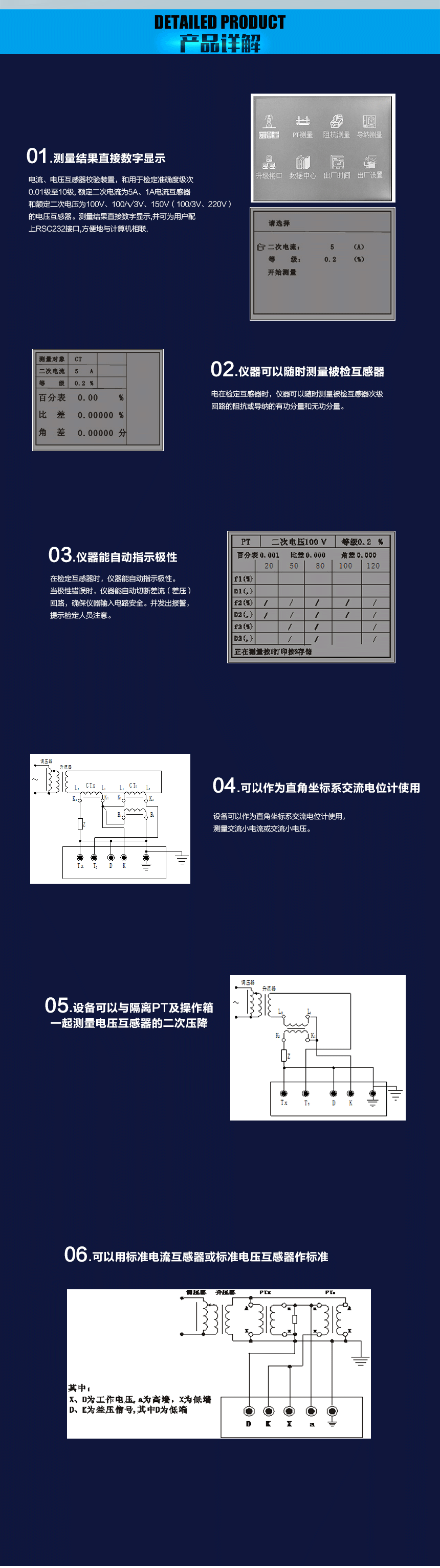 1、電流、電壓互感器校驗(yàn)裝置,和用于檢定準(zhǔn)確度級(jí)次0.01級(jí)至10級(jí),額定二次電流為5A、1A電流互感器和額定二次電壓為100V、100/√3V、150V(100/3V、220V)的電壓互感器。測(cè)量結(jié)果直接數(shù)字顯示,并可為用戶配上RSC232接口,方便地與計(jì)算機(jī)相聯(lián).