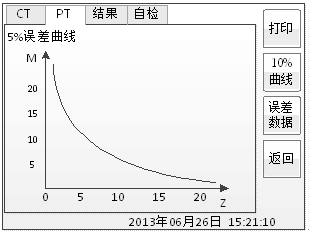 在智能互感器測試儀圖2.15中,還可以選擇顯示10%的誤差曲線。智能互感器測試儀保護互感器的10%誤差曲線是10%誤差數(shù)據(jù)的圖形化顯示,其含義是相同的,其含義為互感器復合誤差不大于10%時,其二次負荷與過流倍數(shù)的關系曲線。5%的誤差曲線是互感器復合誤差不大于5%時,其二次負荷與過流倍數(shù)的關系曲線。