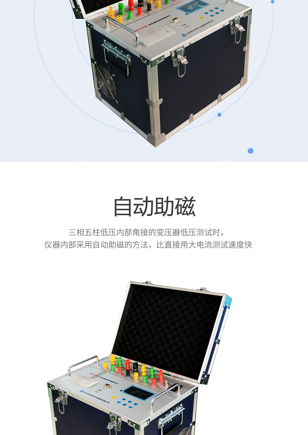 3、三相五柱低壓內部角接的變壓器低壓測試時,儀器內部采用自動助磁的方法,比直接用大電流測試速度快;