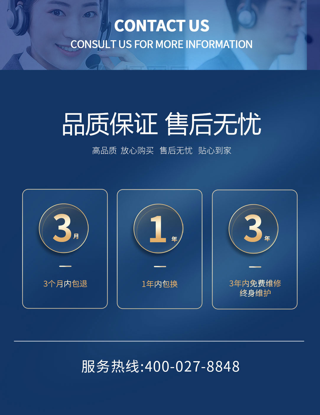 我們的售后服務承諾是:“3個月內包退,1年內包換、3年免費維修,終身維護”。在未來的日子里,我們將一如既往的堅持三類星級服務!