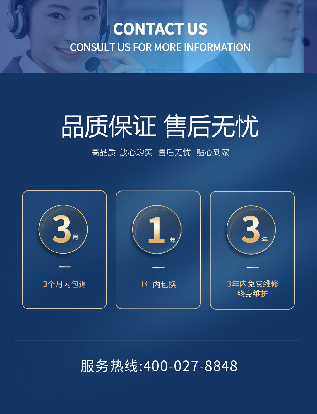 我們的售后服務(wù)承諾是:“3個(gè)月內(nèi)包退,1年內(nèi)包換、3年免費(fèi)維修,終身維護(hù)”。在未來(lái)的日子里,我們將一如既往的堅(jiān)持三類(lèi)星級(jí)服務(wù)!