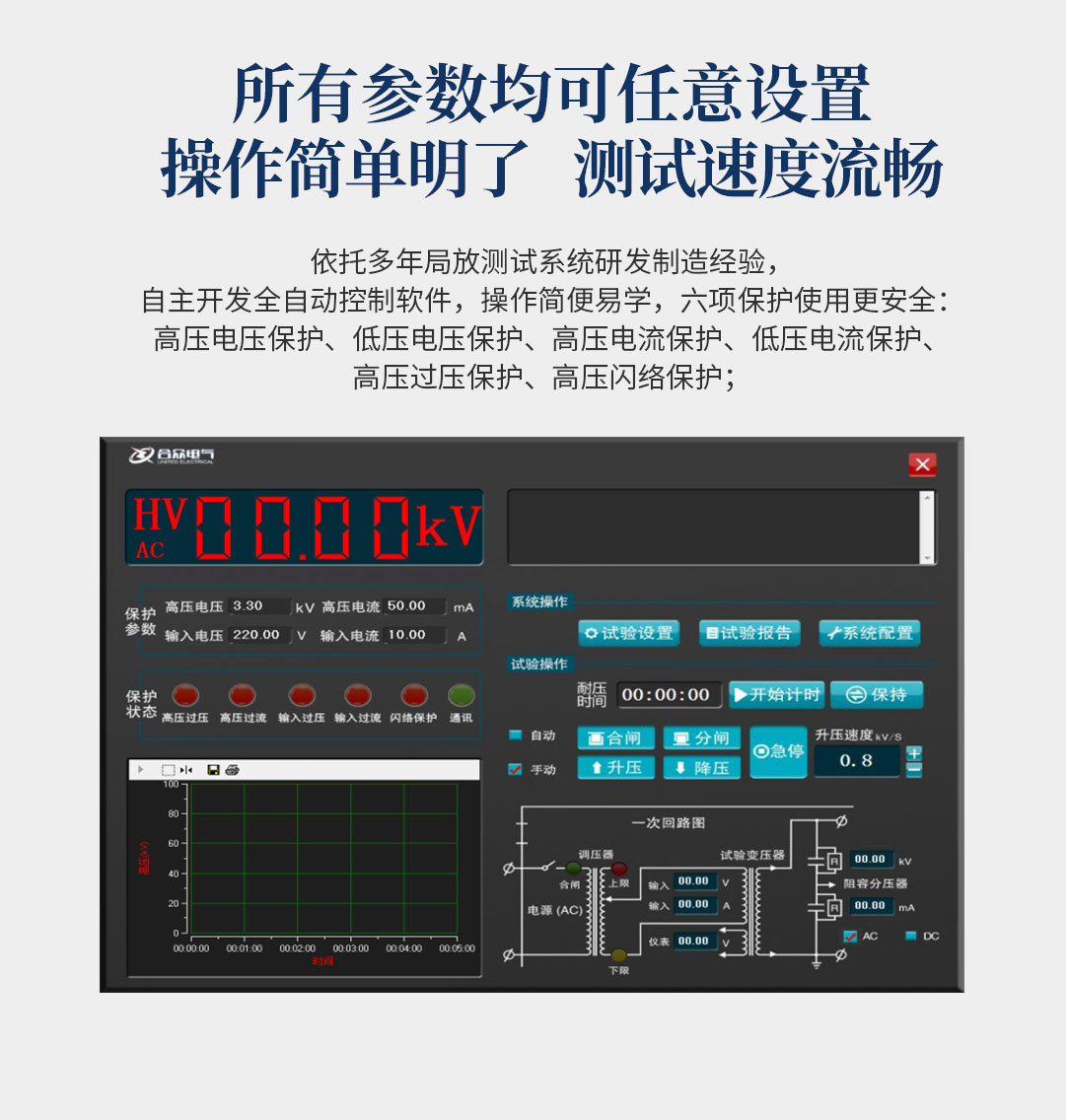 6、所有測(cè)試參數(shù)可提前進(jìn)行設(shè)置,能達(dá)到高壓電壓放電擊穿電壓準(zhǔn)確記憶、儲(chǔ)存、復(fù)位一系列功能;自動(dòng)掃描時(shí)間設(shè)定,自動(dòng)存儲(chǔ)電老化過(guò)程中的時(shí)間、電壓、電流等詳細(xì)記錄,方便用戶(hù)查看;